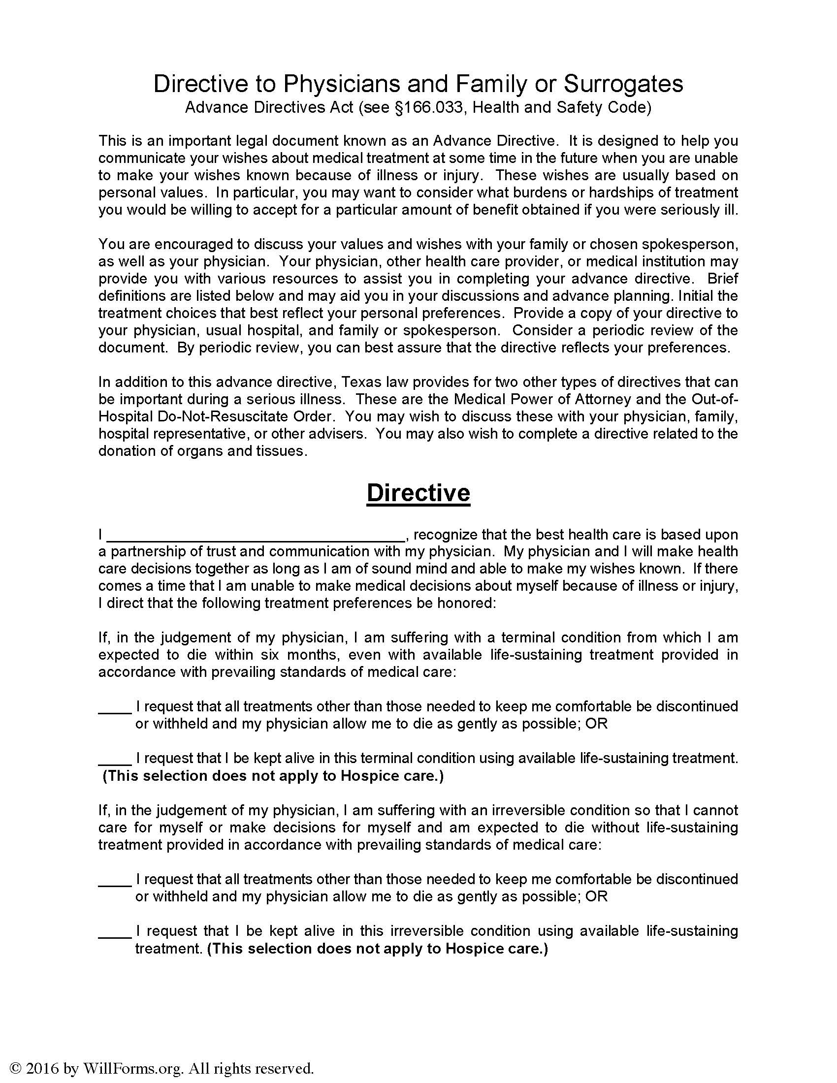 Living Will Directive Form – A living will form free printable is a document that clarifies what types of healthcare and treatment you intend to receive when you’re not qualified to discuss it. That’s why the document can possibly bring a tranquil mind to yourself and your enjoyed ones. Nearly every person can easily create one, especially by utilizing a practical Living Will Directive Form and leave their dreams on the treatment they desire (or don’t desire) to obtain.