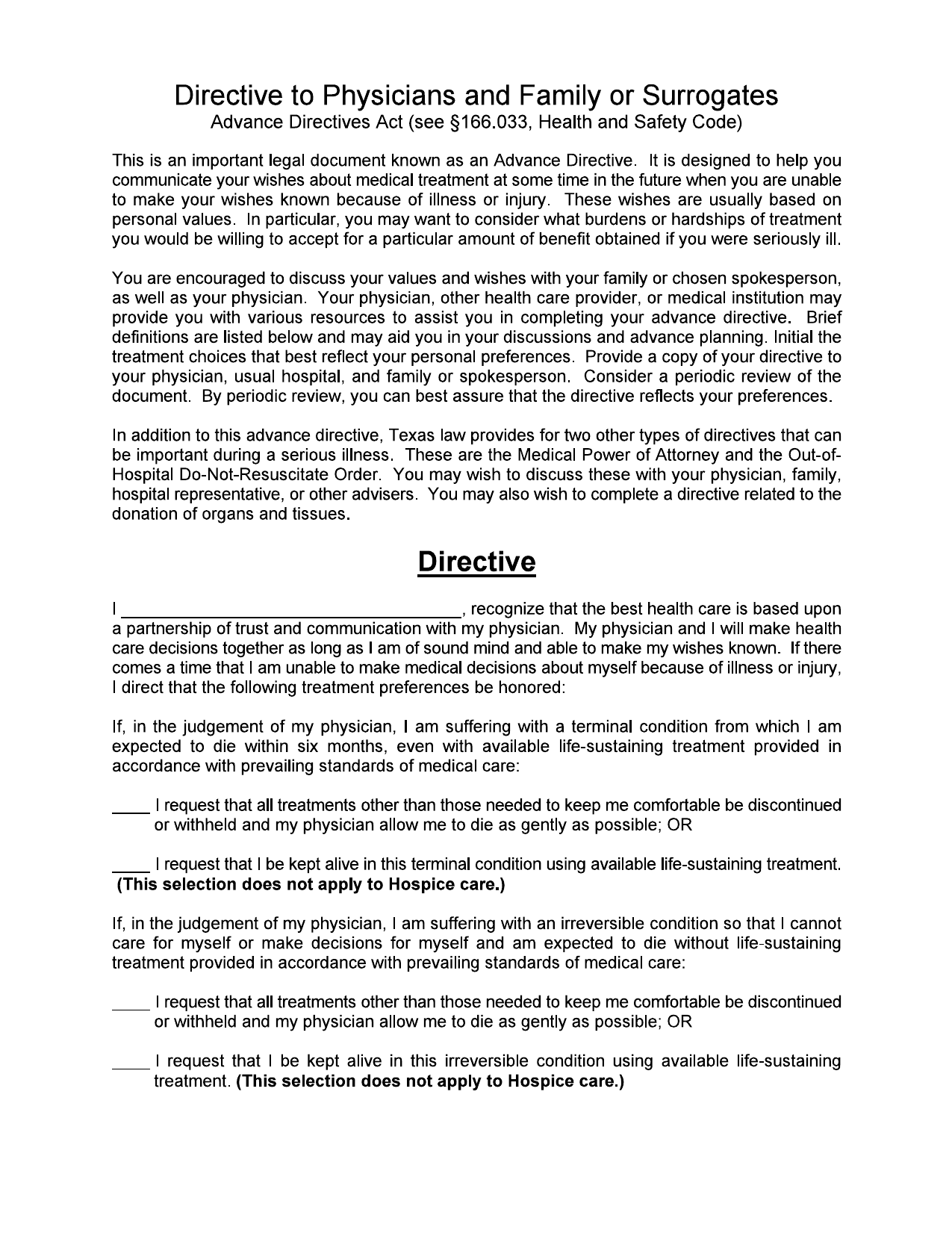 Living Will Form Texas – When you’re not capable to speak about it, a living will form free printable is a document that describes what types of clinical care and also therapy you desire to get. That’s why the document can potentially bring a calm mind to yourself and your loved ones. Nearly every person can conveniently produce one, specifically by utilizing a hassle-free Living Will Form Texas and also leave their wishes on the treatment they desire (or don’t want) to receive.
