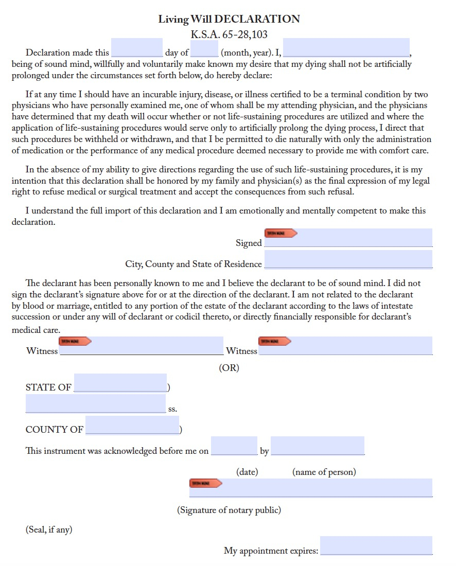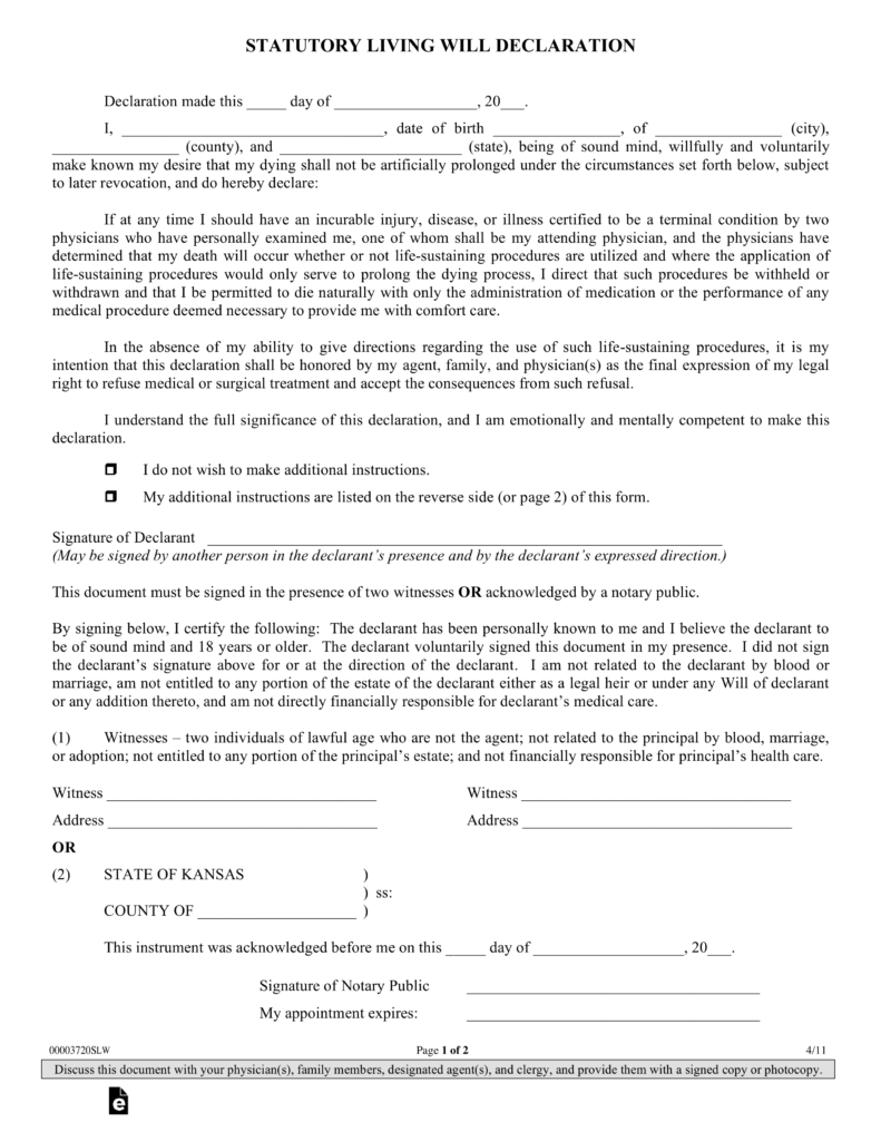Living Will Kansas Form Free – A living will form free printable is a document that describes what kinds of medical care and also therapy you wish to obtain when you’re not capable to mention it. That’s why the document can potentially bring a tranquil mind to on your own and also your enjoyed ones. Almost everybody can conveniently develop one, particularly by utilizing a practical Living Will Kansas Form Free and also leave their wishes on the care they desire (or do not want) to obtain.