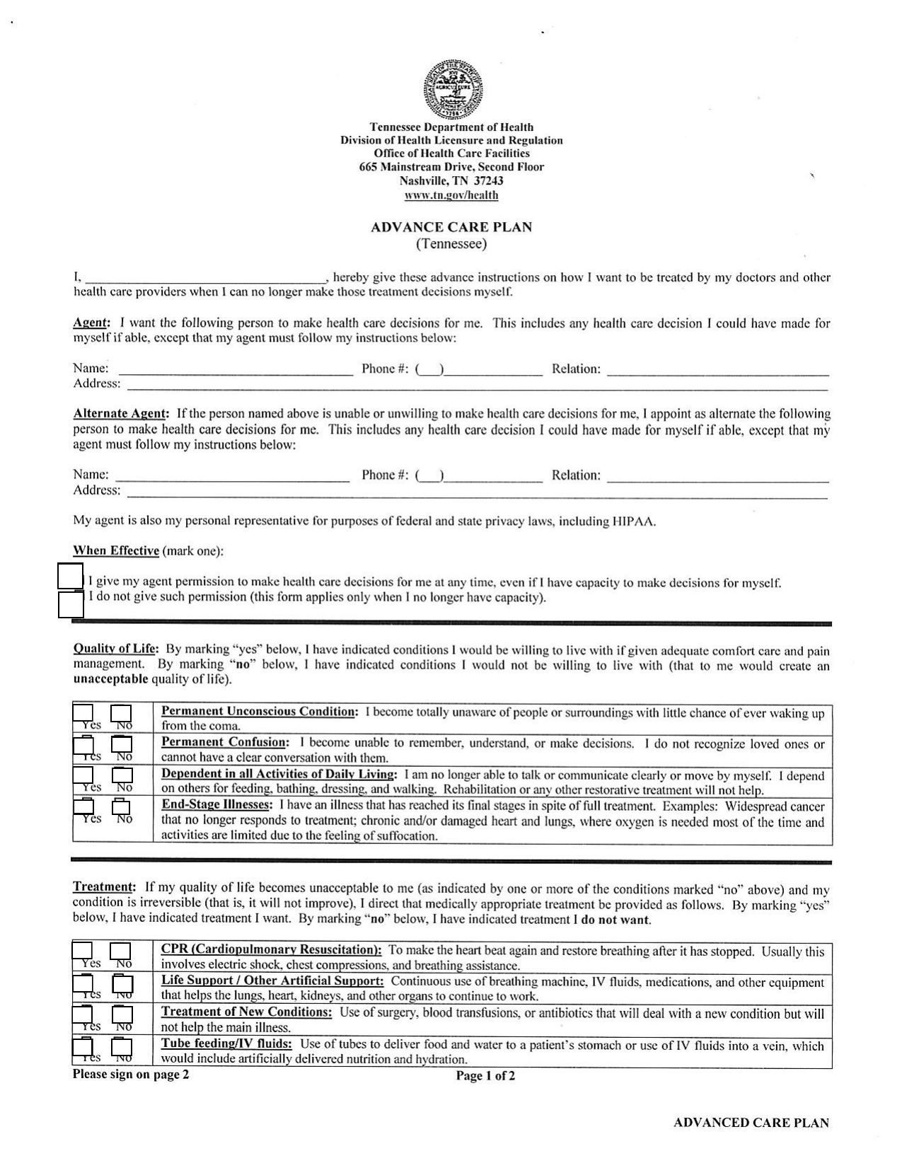 Living Will Tennessee Free Form – A living will form free printable is a document that clarifies what types of medical care and also therapy you wish to obtain when you’re not capable to speak about it. That’s why the document can possibly bring a tranquil mind to on your own and also your loved ones. Almost every person can quickly produce one, especially by using a convenient Living Will Tennessee Free Form as well as leave their wishes on the care they want (or do not desire) to obtain.