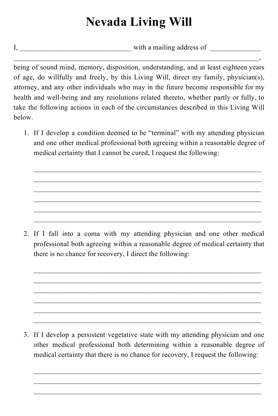 Nevada Living Will Form Free – When you’re not qualified to talk about it, a living will form free printable is a document that clarifies what types of medical treatment and also therapy you desire to obtain. That’s why the document can possibly bring a relaxed mind to yourself and also your liked ones. Almost everyone can easily create one, especially by using a hassle-free Nevada Living Will Form Free and also leave their desires on the treatment they desire (or don’t want) to get.